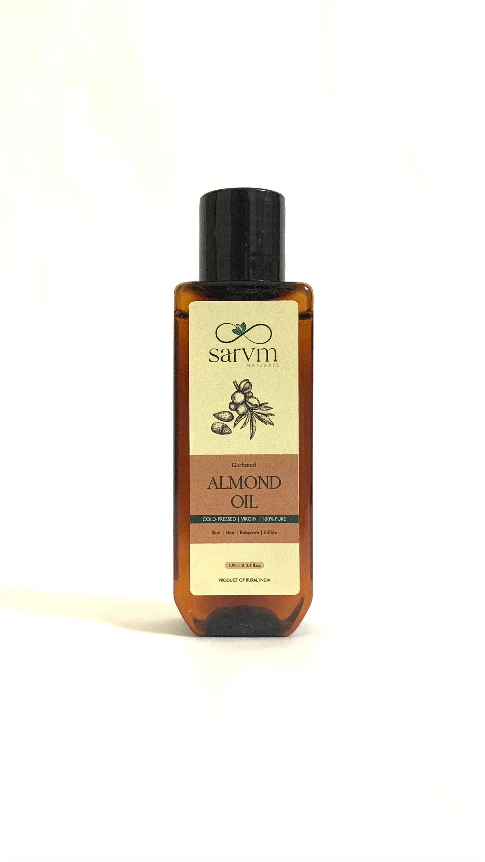 Sarvm Naturals 100% pure cold pressed virgin almond oil is made with vitamin filled Gurbandi almonds. This oil is enriched with Vitamin A, E, Omega-3 fatty acids and Zinc. Ancient Ayurvedic practices have used almond oil for centuries to help soothe and soften the skin and to treat minor wounds and cuts. Also used in food to enhance the nutty flavour.