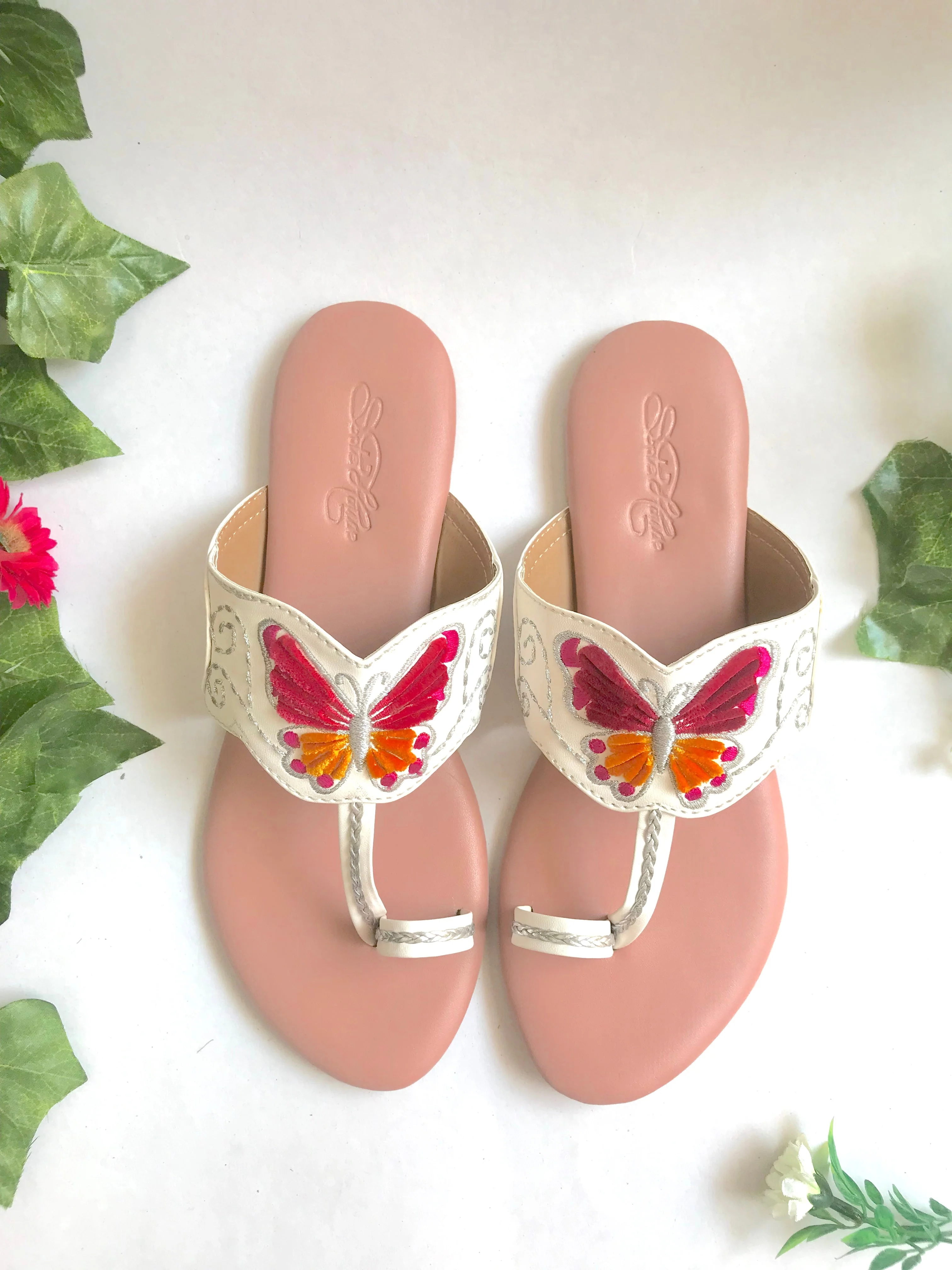 White Vegan Leather with Velvet Cut Butterfly in Pink and Orange with Silver Thread Swirls