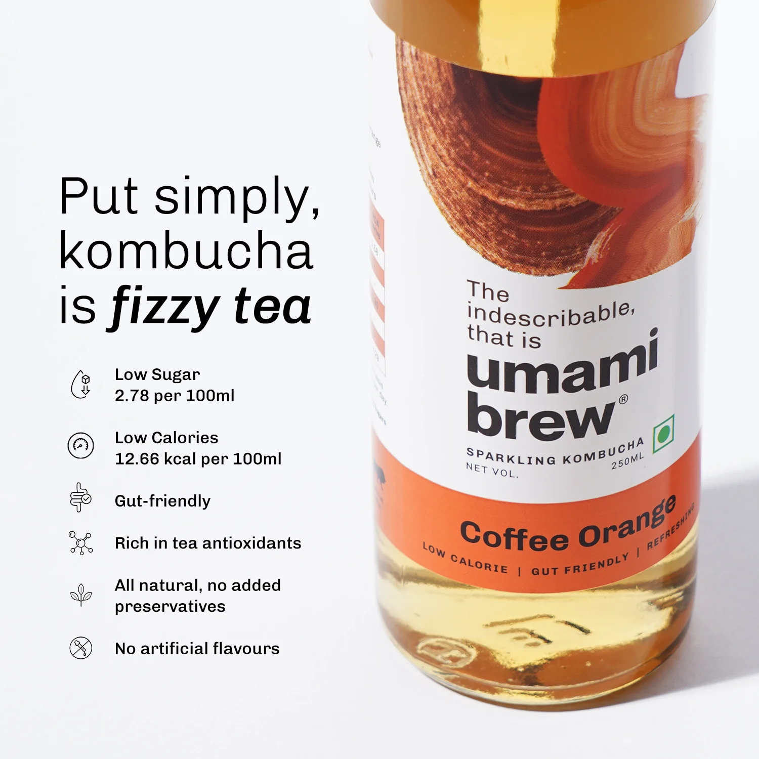 Ingredients: Filtered Water, Kombucha Culture, Cane Sugar, Coffee, 4% Orange Juice,Carbon Dioxide