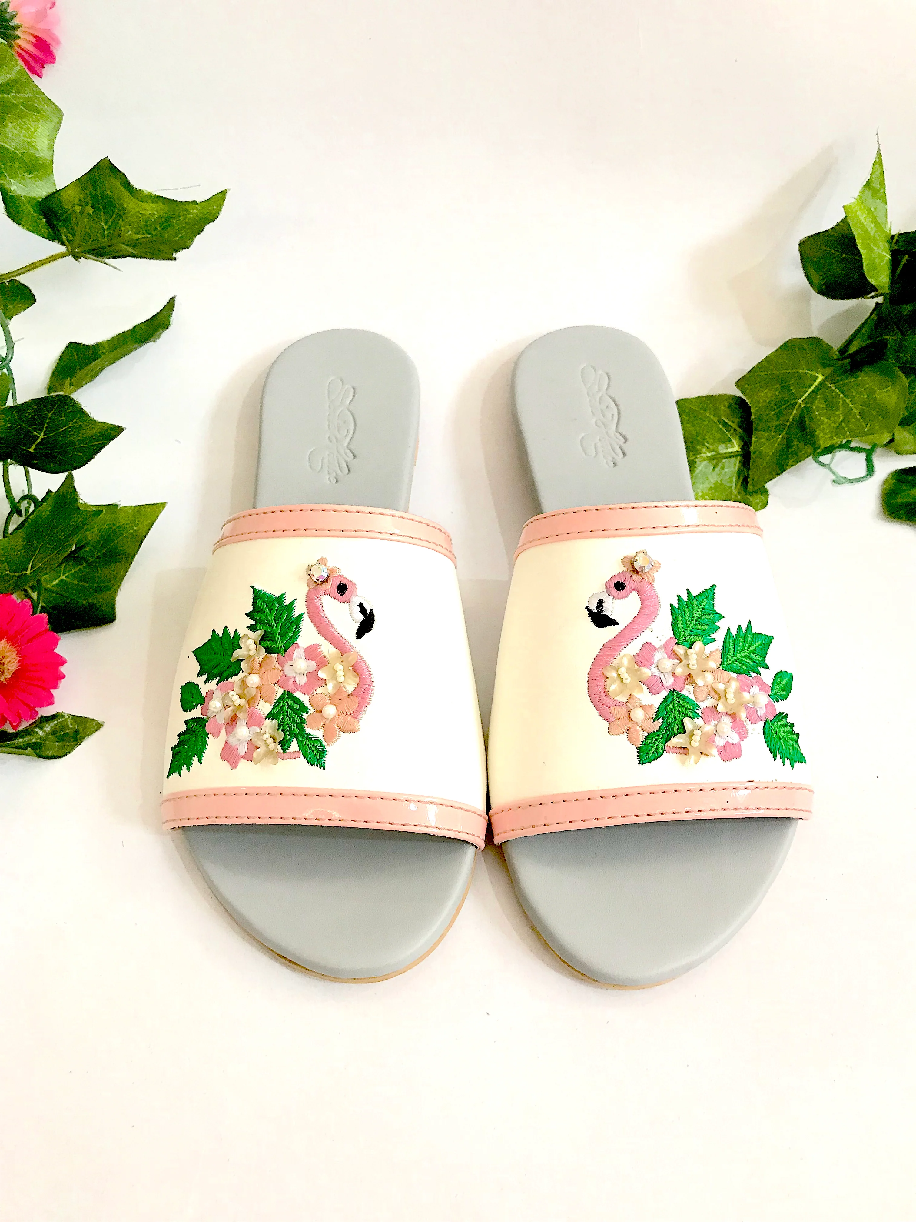 White Crème Vegan leather with Flamingo Embroidery , Small 3D flowers and small Rhinestones